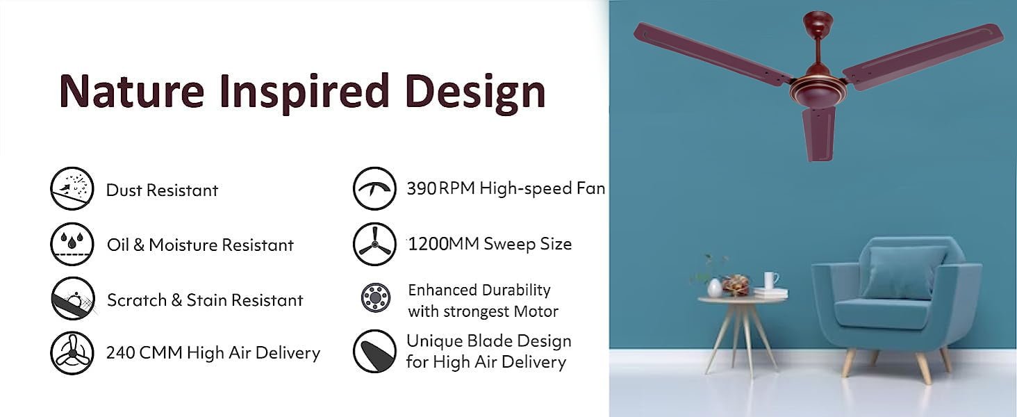 Designed with 1200 mm blades to offer an airflow that ensures a wider conical spread of breeze in all corners of the room. Power Consumption: The high-end engineering of this ceiling fan helps it consume just 60 W of power, so there’s no need to worry about the electric bill.
