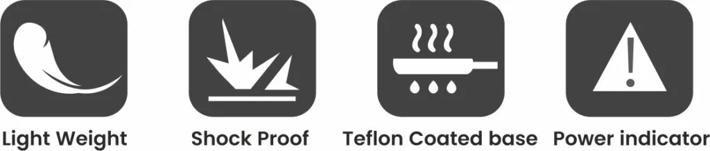 German grade non-stick coated sole plate Cast In Sole Plate, Technology for Faster and Uniform Heating, Shock Proof Plastic Body Thermostat for Variable Temperature Control, Thermal Fuse For Over Heat Safety Protection, Silk Braided, Power Cord with Stress Reliever & Twist Reliever, Cool Touch Body with Comfortable, Handle Grip, Super Clean Surface Finish with Pleasant Aesthetics, Button Groove reaches Into Tricky Areas Cord Winder Facility, power 750 watts, Power Indicator.